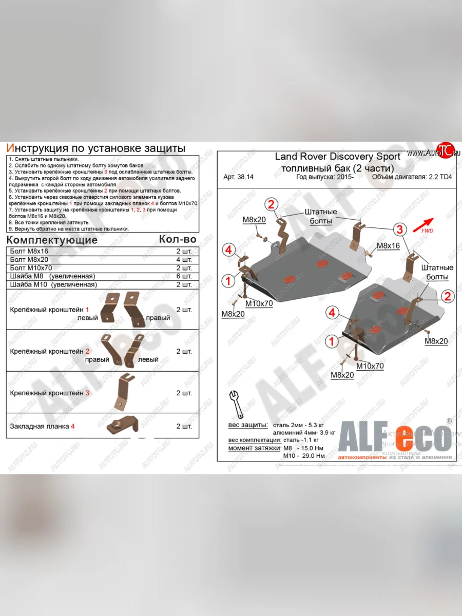 | Наименование | Защита топливного бака (V-2,0 TD; 2,2 TD АТ 4WD, 2 части) Alfeco (Алюминий 3 мм) в Воронеже Воронежской области |